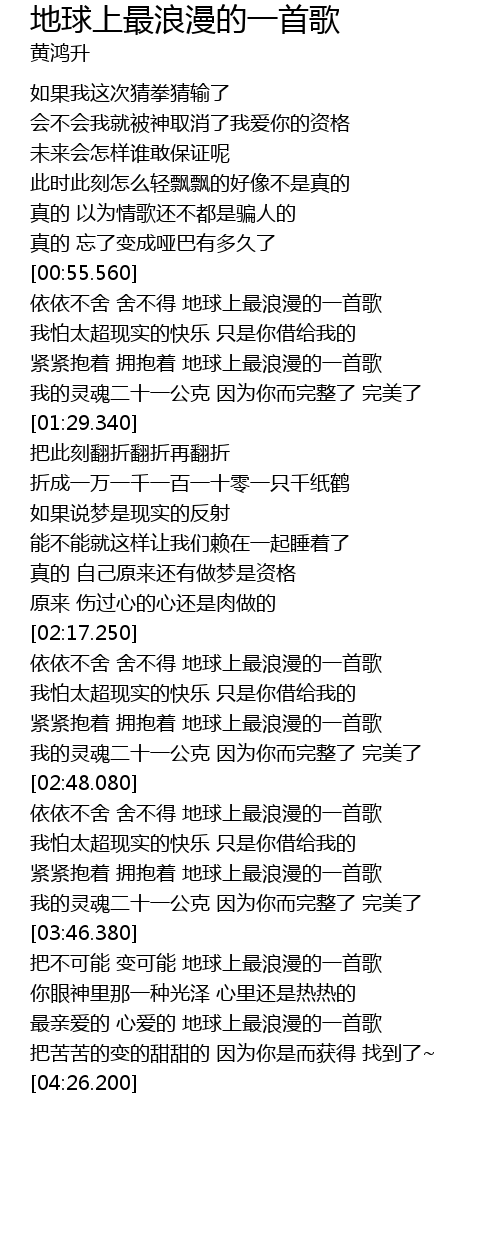 黃鴻升 Alien Huang地球上最浪漫的一首歌Official Music Video ROCK HERO 黃鴻升 第1號個人專輯LOVE_HERO 愛英雄 K歌三部曲no3地球上最浪漫的一首歌 用我的鼻子摩擦你的脖子愛情的空間就香味四溢 留在我手掌上的是你每天都對我說的一句話 用時間. 地球上最浪漫的一首歌-Lyrics- 如果我這次猜拳猜輸了 會不會我就被神取消了 我愛你的資格 未來會怎樣誰敢保證呢 此時此刻怎麼輕飄飄的 好像不是真的 真的. Jun 5 2013 - rock hero黃鴻升 第1號個人專輯love_hero 愛英雄k歌三部曲no3地球上最浪漫的一首歌用我的鼻子摩擦你的脖子愛情的空間就香味四溢留在我手掌上的是你每天都對我說的一句話用時間證實我愛你而你是地球上最浪漫的一首歌地球上最浪漫的一首歌作詞fun4樂團作曲fun4.